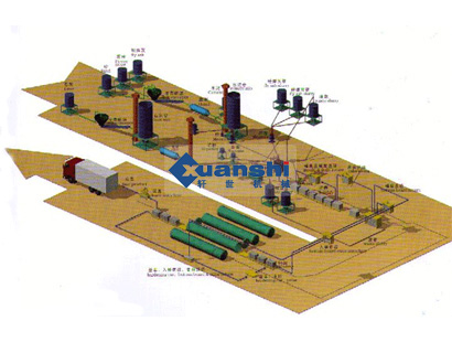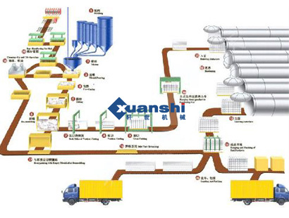 首先將貯存的原材料經(jīng)計(jì)量配料(1)后進(jìn)入澆注攪拌機(jī)內(nèi),經(jīng)攪拌(2)均勻后澆注溫度和時(shí)間的預(yù)養(yǎng)(4)坯體達(dá)到一定硬度后,由翻轉(zhuǎn)吊具把模具和坯體吊至切割機(jī)上。翻轉(zhuǎn)吊具完成下列功能:a把模具在空中作90度翻轉(zhuǎn)(5)(模具的一側(cè)板成為支承坯體的底板直至蒸養(yǎng)出成品),b吊運(yùn)載小車或切割支撐架上完成開模、脫模(6),c脫下的模框和返回的蒸養(yǎng)側(cè)板(16)再重新組合成模具(17)等待清理后噴油(18)重新澆注。坯體在切割機(jī)上分步作六面切割;a首先進(jìn)行坯體兩側(cè)面垂直切割(7),b然后進(jìn)行縱向水平式切割(8);c最后進(jìn)行橫向水平式切割(9)。切割好的坯體由半成品吊具連同底板吊至蒸養(yǎng)小車(10),然后編入蒸壓釜(11)進(jìn)行高溫蒸養(yǎng)(12),蒸養(yǎng)好后出釜(13),由成品吊具將成品堆垛(14)或裝車、打包(15)蒸養(yǎng)側(cè)板則返回。(16)加氣混凝土生產(chǎn)設(shè)備裝備:加氣混凝土生產(chǎn)設(shè)備的選型和數(shù)量根據(jù)工藝設(shè)計(jì)方案而確定,根據(jù)工藝設(shè)計(jì),澆注分為固定式和移動(dòng)式兩種澆注,切割方式目前國(guó)內(nèi)以翻轉(zhuǎn)切割為主,其它配料系統(tǒng)、蒸壓養(yǎng)護(hù)等設(shè)備都大同小異。